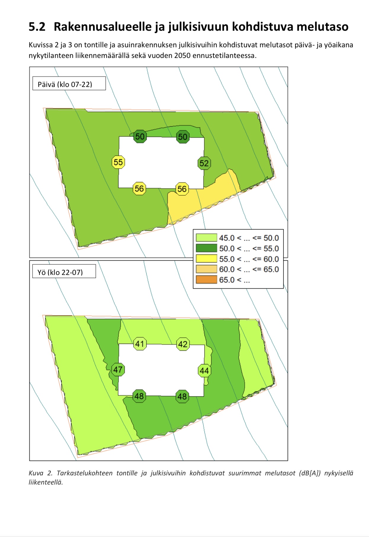 Espoon kaupunki on määrännyt tietyille alueille melukartoituksen pakolliseksi. Kartoituksen melu on Lapinkyläntien ja Kuninkaankartanontien suunnasta, kumpaankin suuntaan on juuri rakennettu kattavat suoja-aidat kaupungin toimesta. Oletuksena on, myös kartoituksessa huomioituna, että alueen kehittyessä liikenne lisääntyy ja siksi kartoitus vaaditaan. Desibelimäärä kartoituksessa on normaalitasoa, eikä aiheuta lisätoimia. Kartoitus on jo teetetty tälle tontille ja sille suunnitellulle talolle. Alla Kuuloliiton vapaa-ajan melutaulukko referenssiksi, alimpana kartoitetut arvot päivä- ja yöaikaan.
